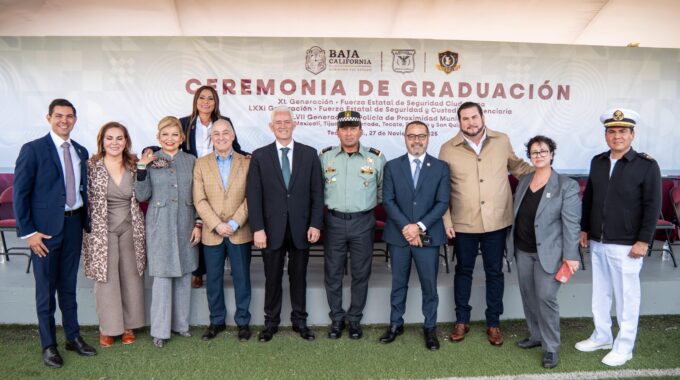 Tecate, Baja California, a 27 de noviembre de 2025. El presidente municipal de Tijuana, Ismael Burgueño Ruiz, acompañó a la Gobernadora Marina del Pilar Avila Olmeda en la Ceremonia de Graduación de 103 nuevos elementos policiacos que se integran a distintas corporaciones de seguridad en Baja California.